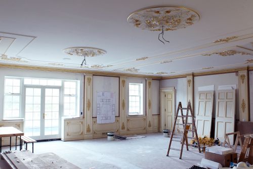 The full refurbishment and decoration of this exceptional property involved collaboration with some of the country's finest craftsmen, delivering intricate ornate plasterwork and exquisite gold leaf finishes. This project exemplifies our commitment to utilizing expert skills to create interiors that are both luxurious and artistically distinguished.